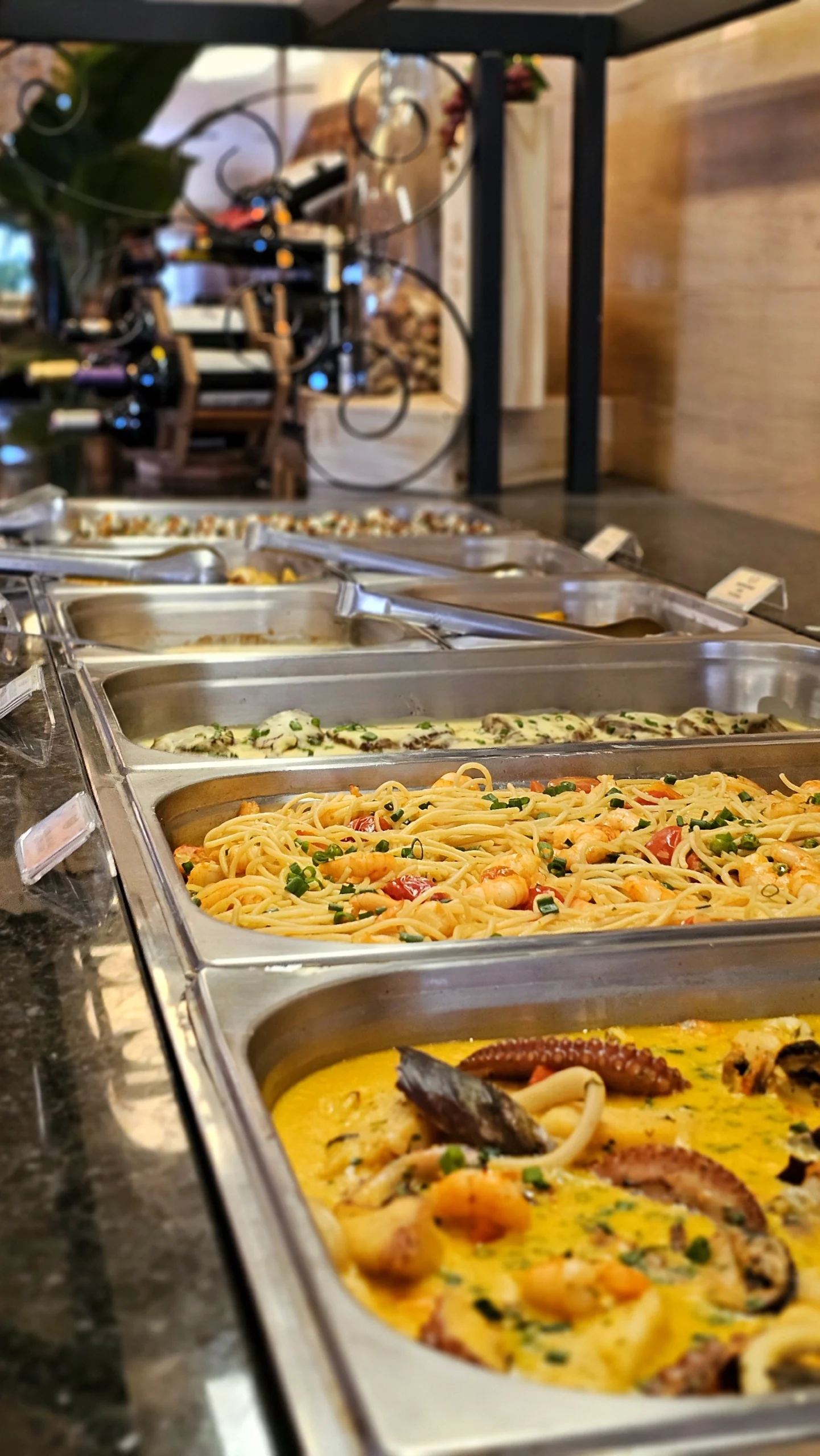Buffet completo todos os dias, com variedade de pratos, carnes, frutos do mar, oriental, massas artesanais e saladas frescas.